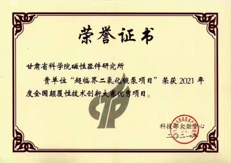 祝賀我單位榮獲 “超臨界二氧化碳泵項(xiàng)目 ” 2021年度全國顛覆性技術(shù)創(chuàng)新大賽優(yōu)秀項(xiàng)目