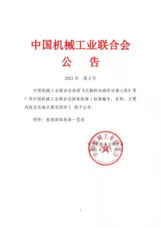 由甘肅省科學(xué)院磁性器件研究所牽頭編制的《無軸封永磁傳動離心泵》標準T/CMIF 149-2021 公布實施